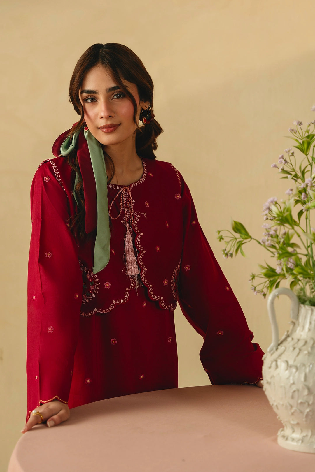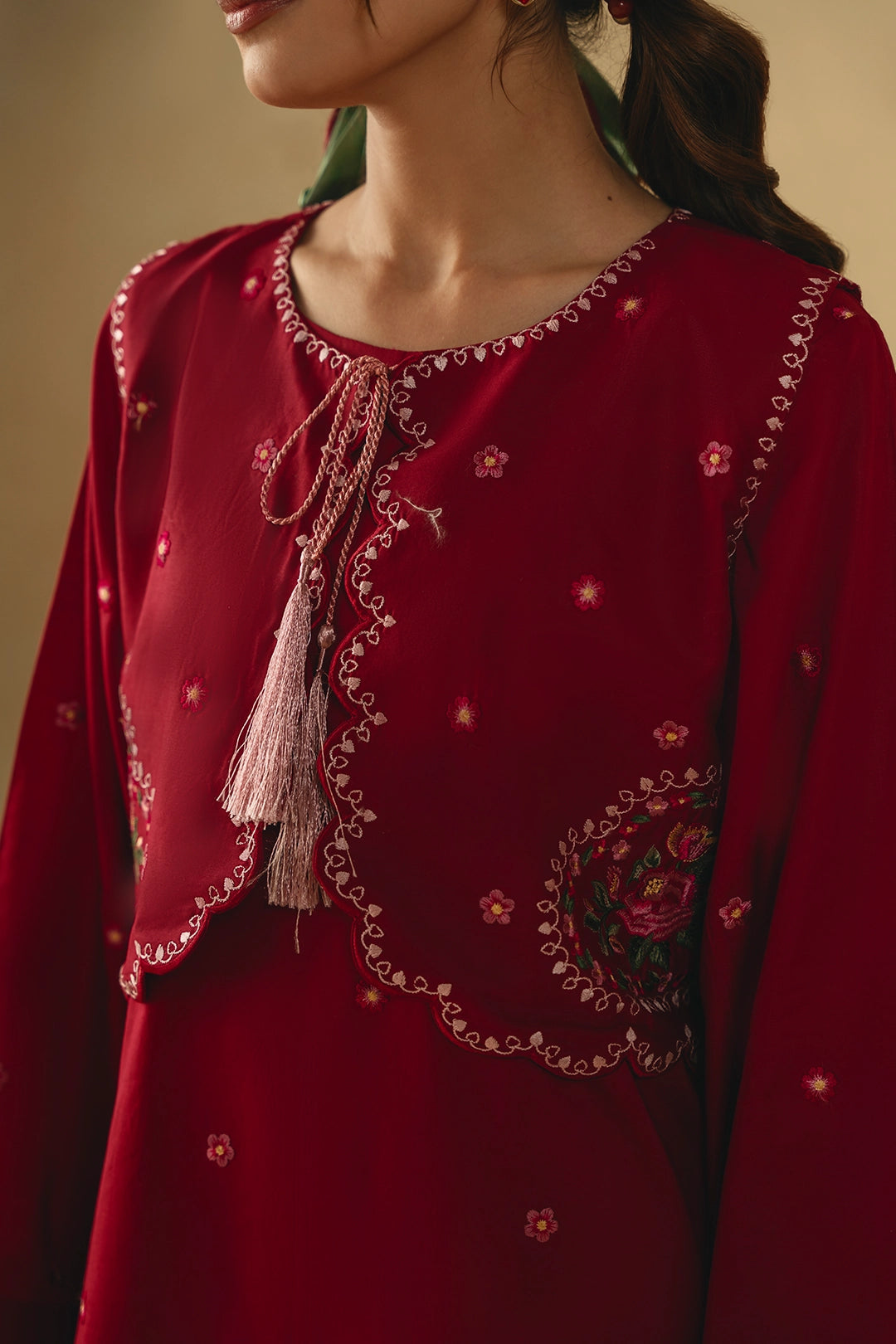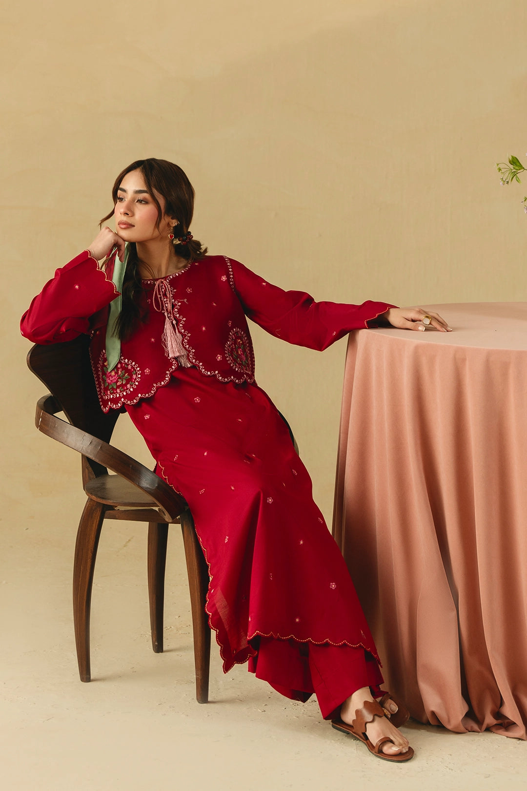 • A charming maroon two-piece ensemble featuring a short embroidered koti with scalloped edges and heart-shaped embroidery on the front and back. Paired with a long embroidered shirt with full-length sleeves and wide trousers, this outfit creates a layered and timeless look.