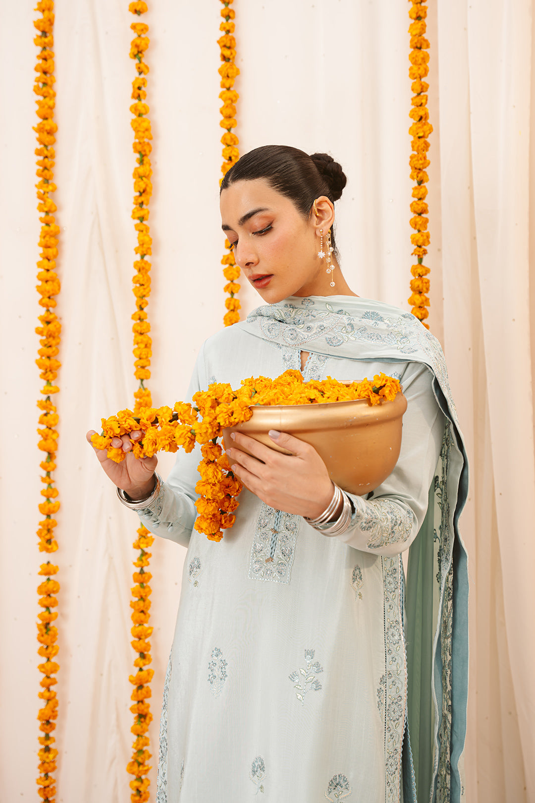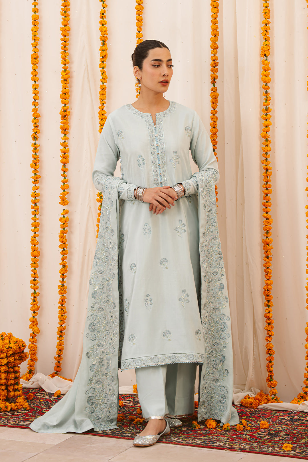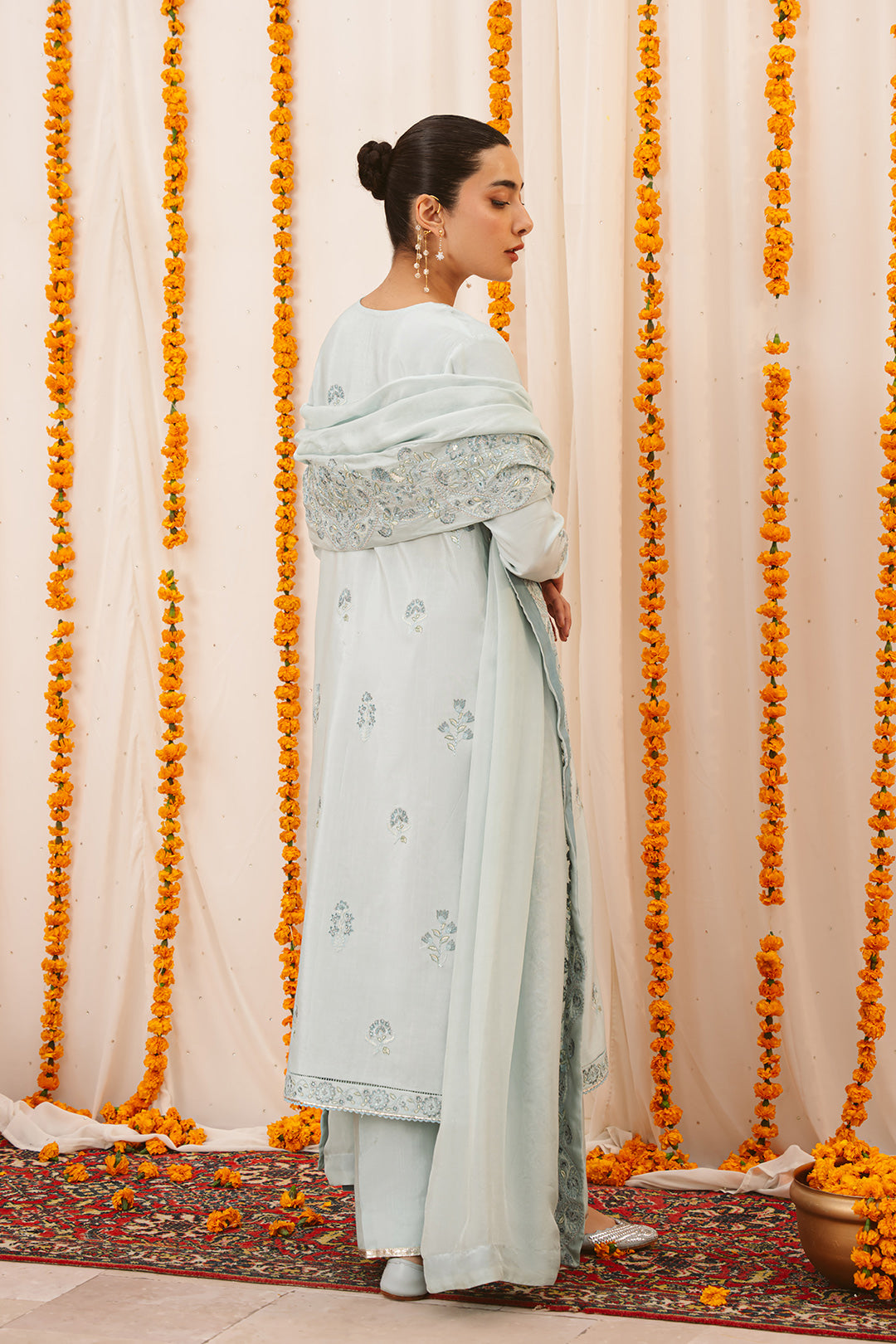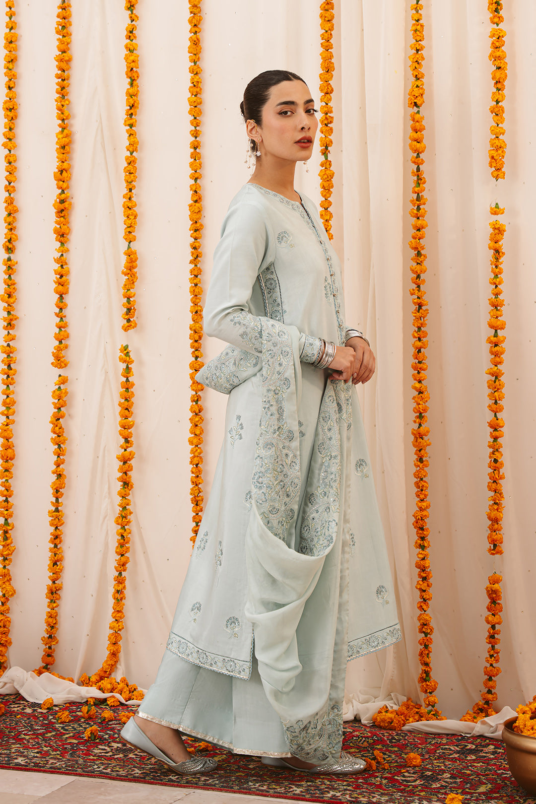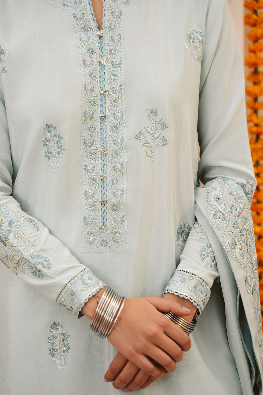 Our signature powder blue three-piece ensemble features a long raw silk shirt, elegantly embroidered on both the front and back, with refined button detailing on the neckline. It is paired with matching trousers enhanced with delicate gota patti detailing and completed with an embroidered silk dupatta, adding a timeless and graceful finish.
