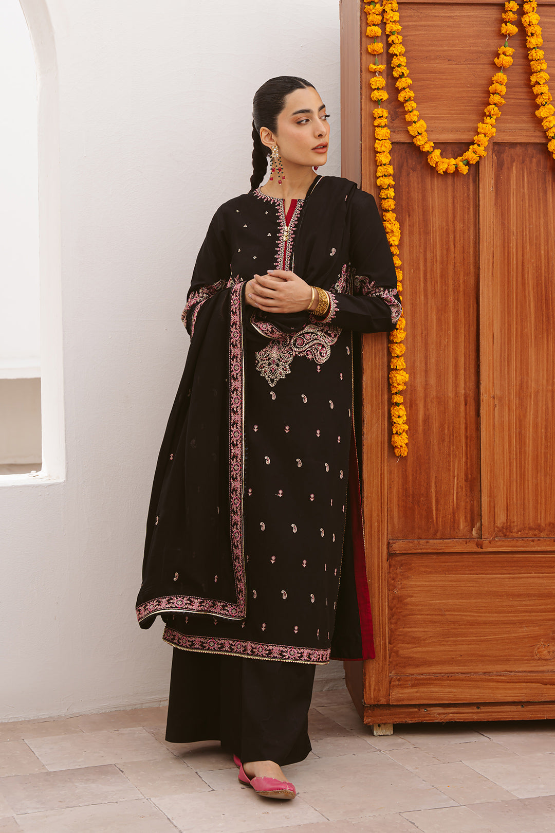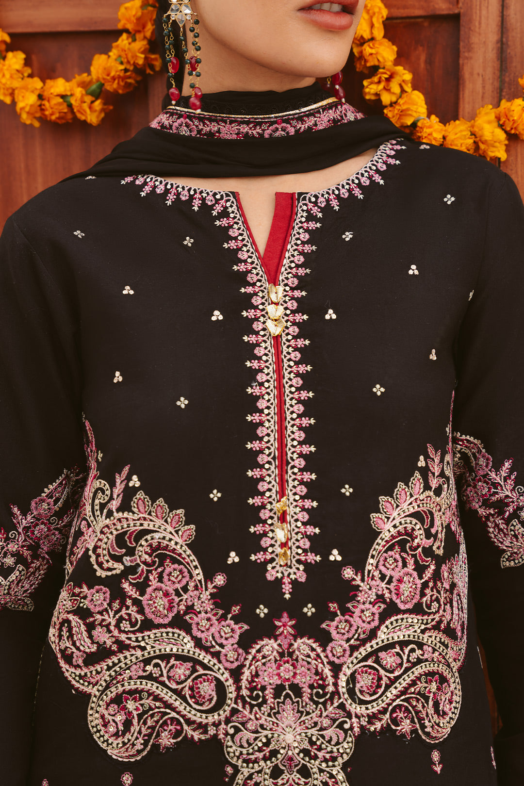 An elegant black silk pishwas is crafted as a three-piece ensemble, featuring beautiful detailed embroidery on both the front and back. The design is thoughtfully elevated with contrasting color facing, adding depth to the look. It is paired with tailored culottes and completed with an embroidered silk dupatta, offering effortless sophistication.