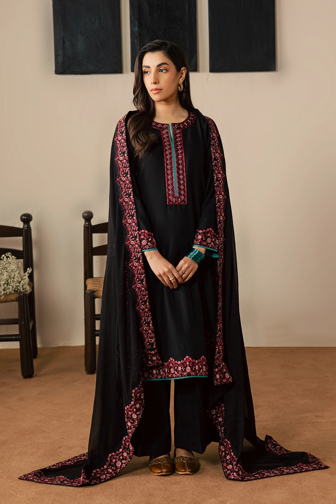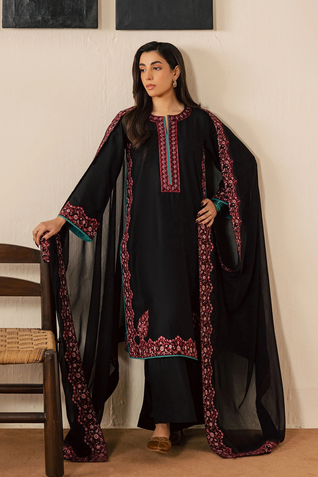 Black embroidered ensemble featuring a detailed neckline with teal stitching accents and intricate embroidery throughout — a perfect blend of elegance and sophistication.