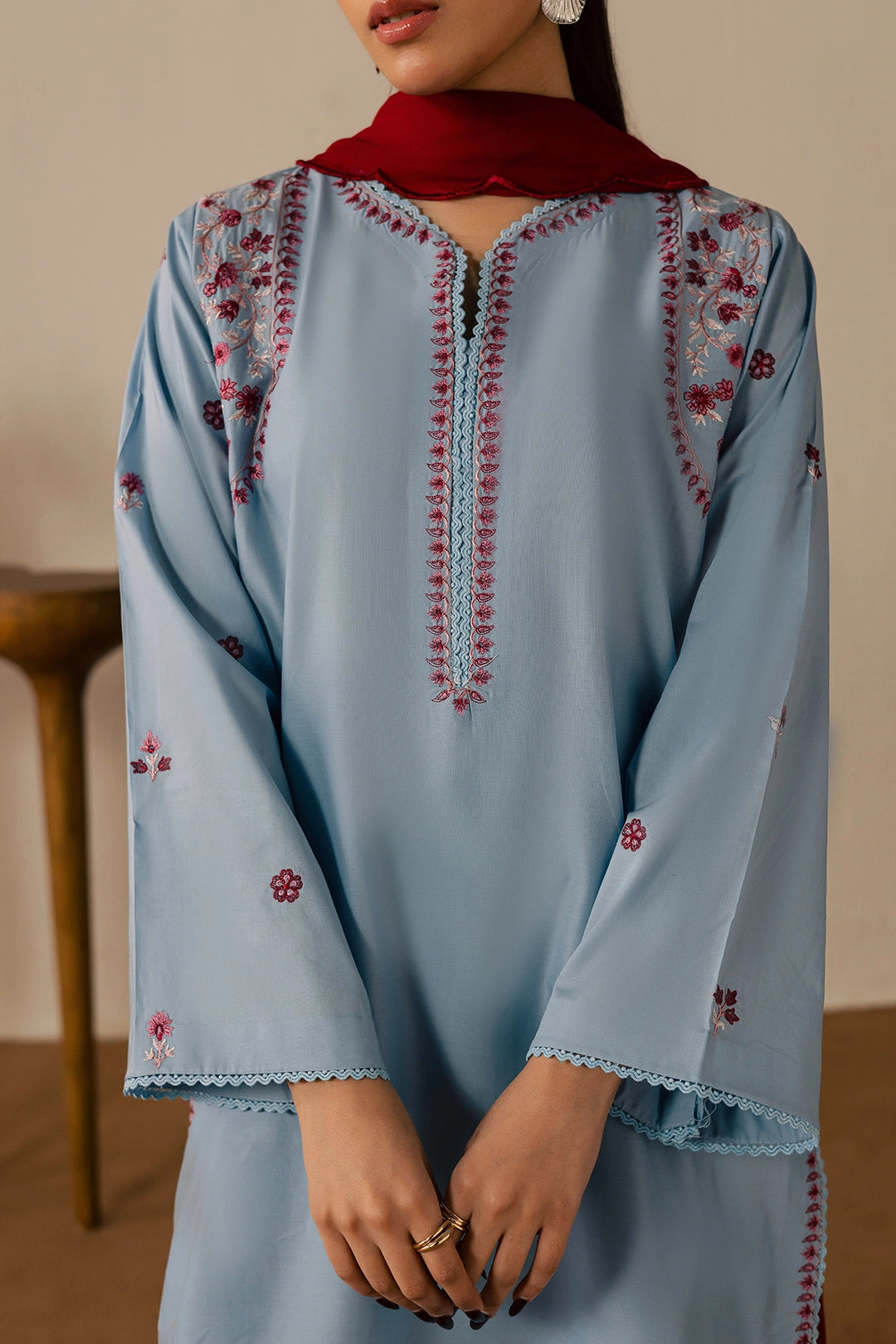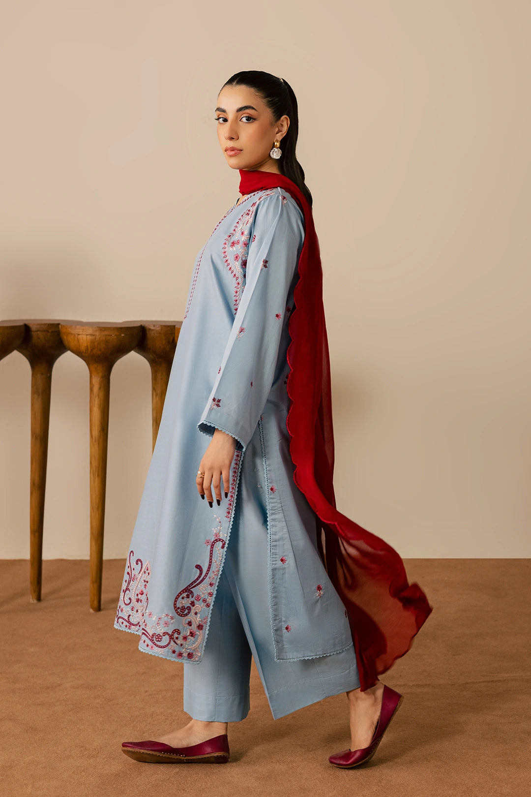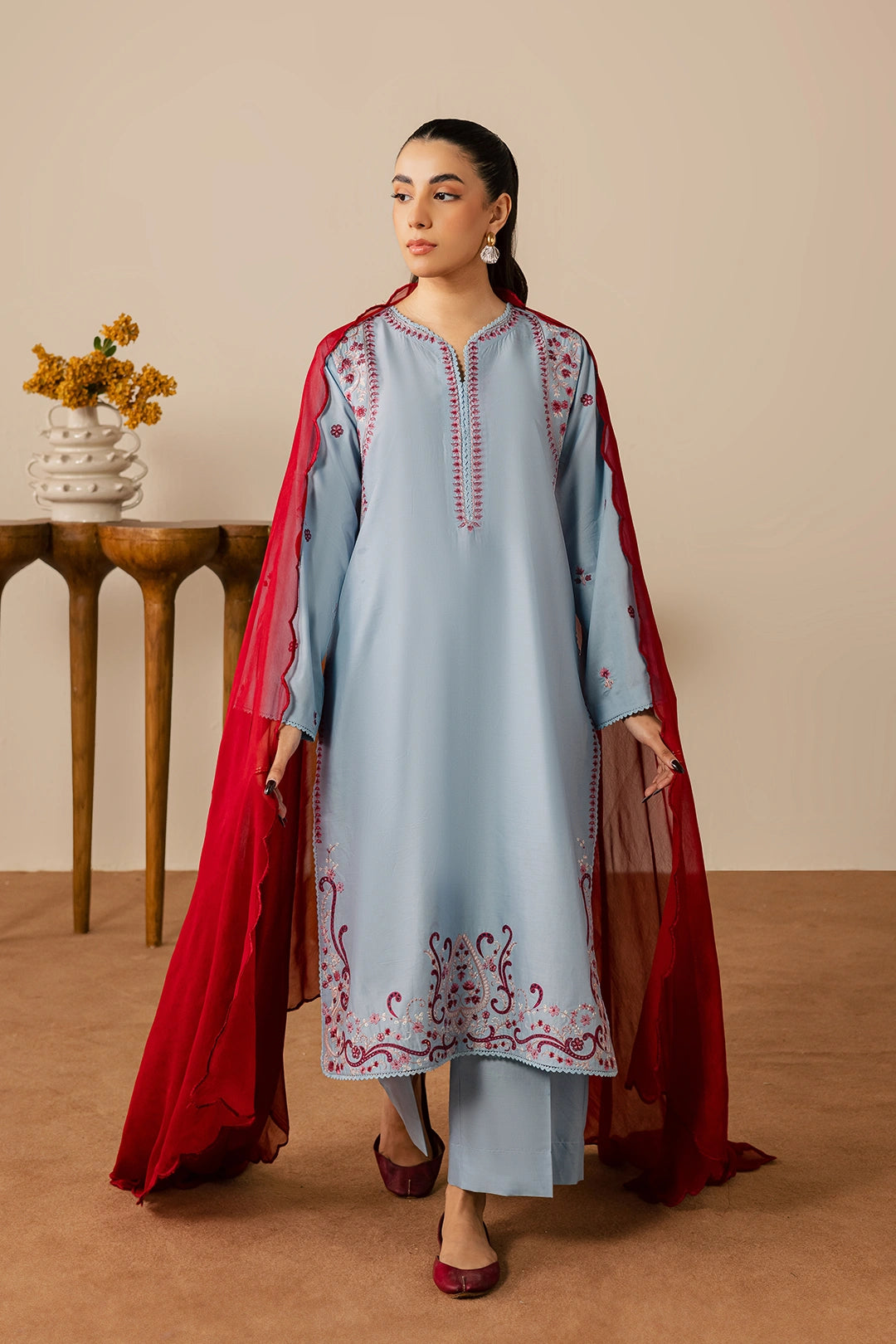 A graceful light blue and red three-piece ensemble crafted from soft cotton fabric, featuring a shirt adorned with an embroidered neckline, hem, and sleeves highlighted with intricate detailing. Paired with plain blue trousers for a balanced look and completed with a chiffon dupatta featuring elegant, scalloped embroidery, this outfit is perfect for a sophisticated festive appearance.