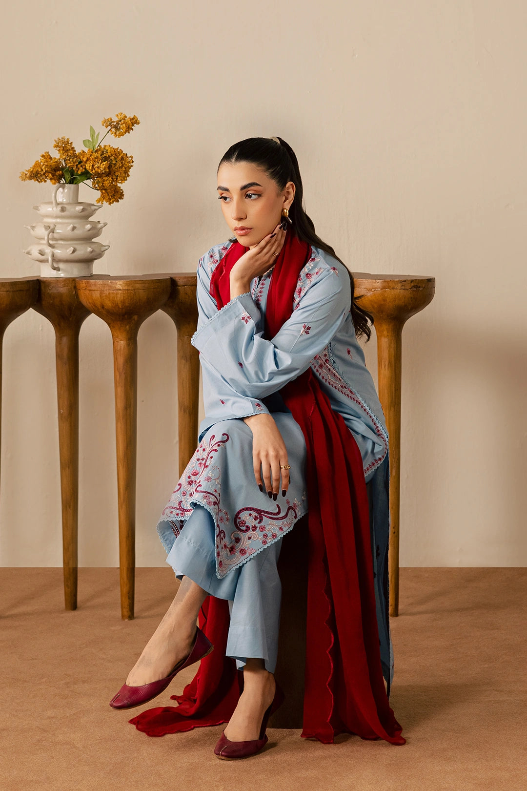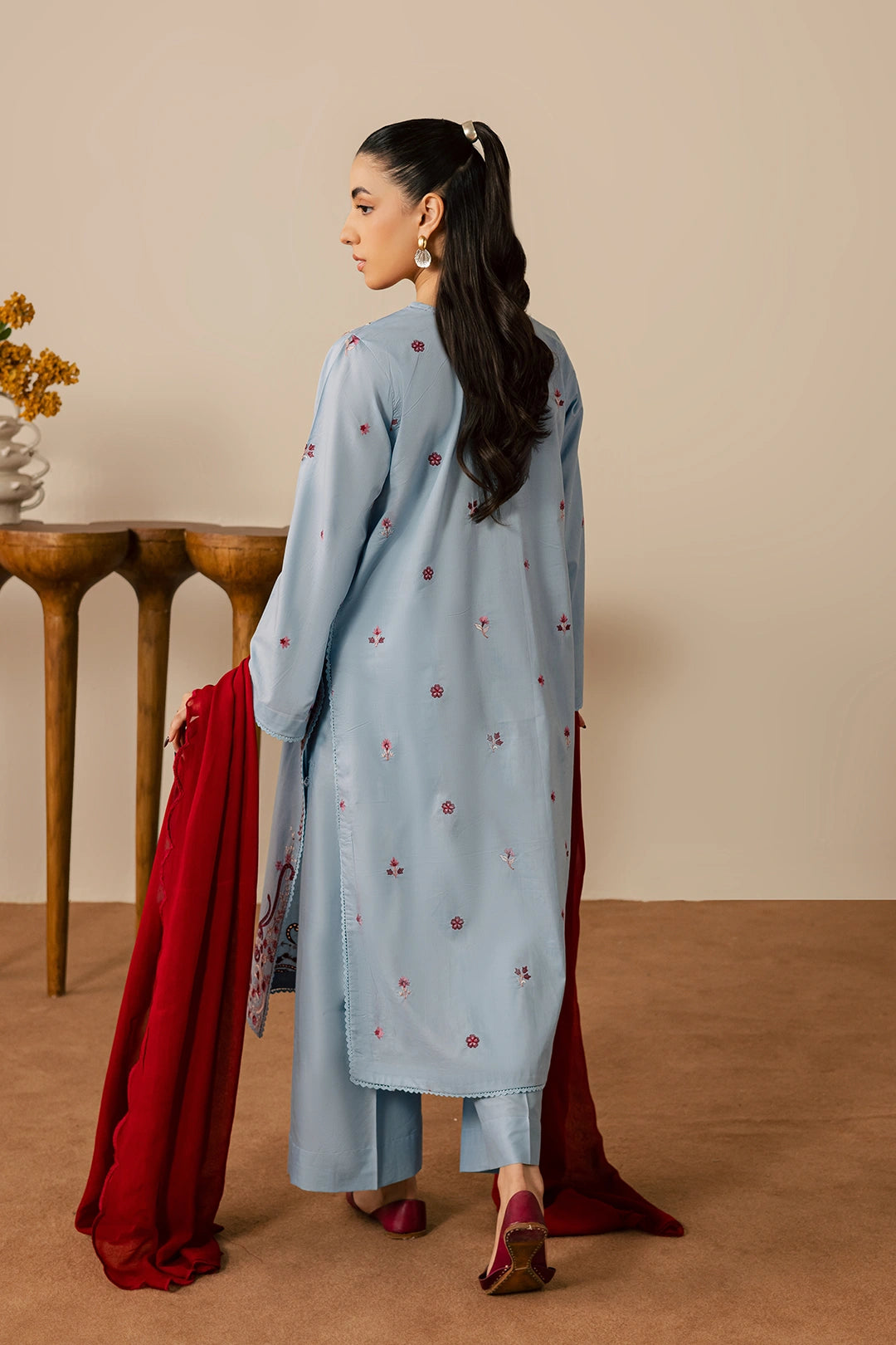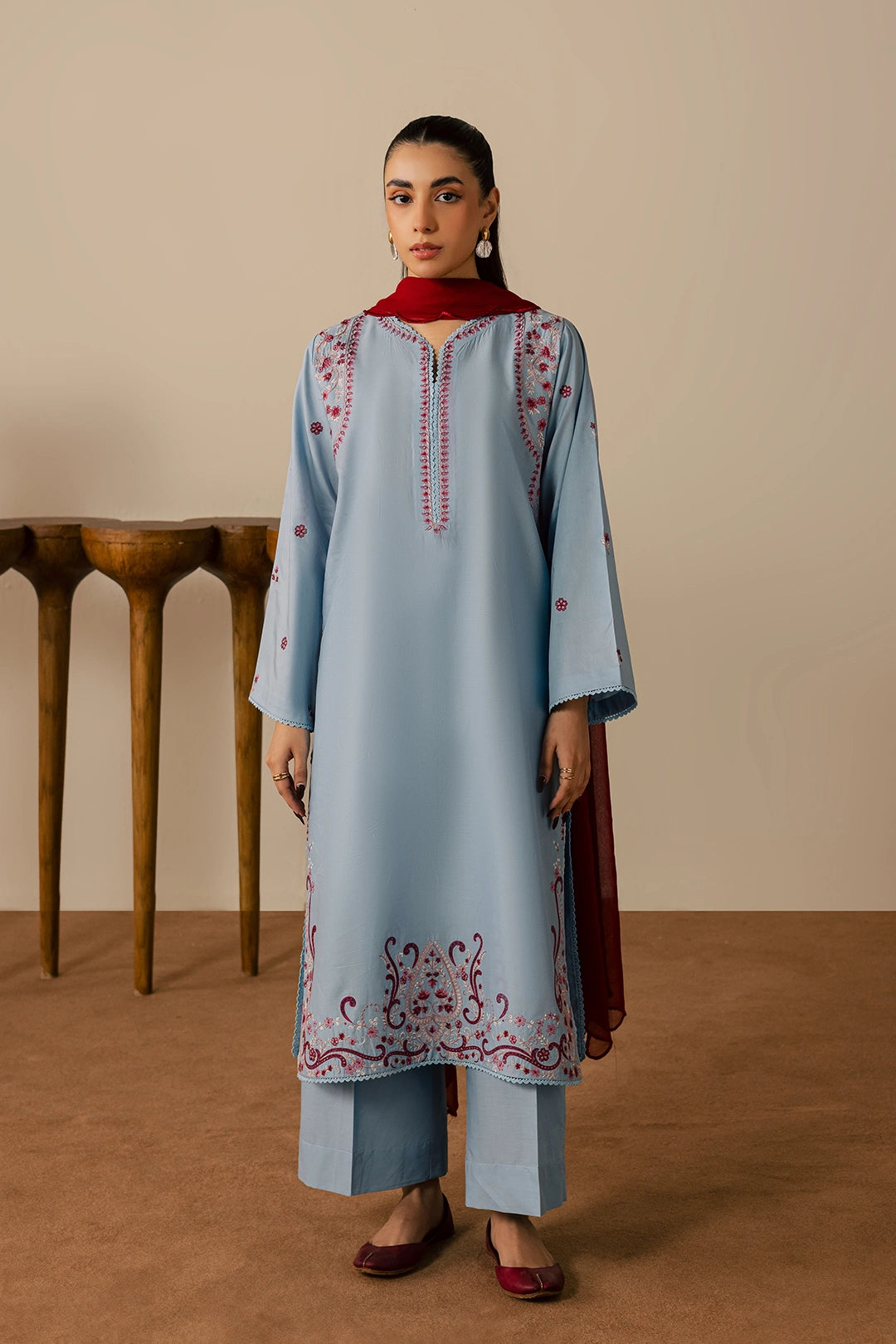 A graceful light blue and red three-piece ensemble crafted from soft cotton fabric, featuring a shirt adorned with an embroidered neckline, hem, and sleeves highlighted with intricate detailing. Paired with plain blue trousers for a balanced look and completed with a chiffon dupatta featuring elegant, scalloped embroidery, this outfit is perfect for a sophisticated festive appearance.