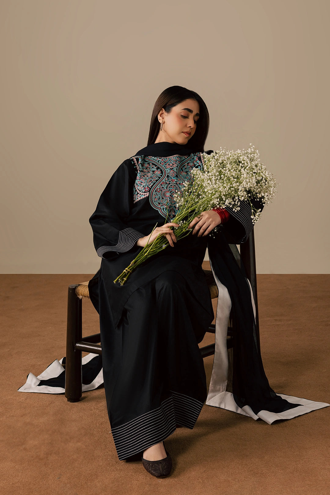 An elegant black three-piece suit crafted in soft cotton, featuring a shirt with a beautifully embroidered neckline and subtle top-stitch detailing on the sleeves. Paired with a graceful farshi shalwar highlighted with matching stitch details and completed with a plain chiffon dupatta, this ensemble is perfect for a refined festive or formal look.