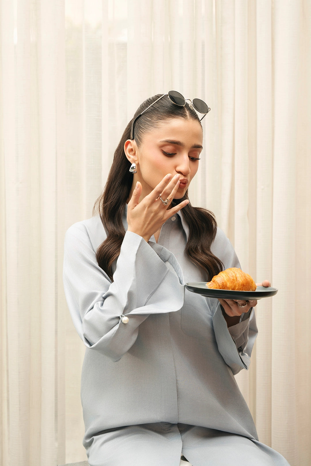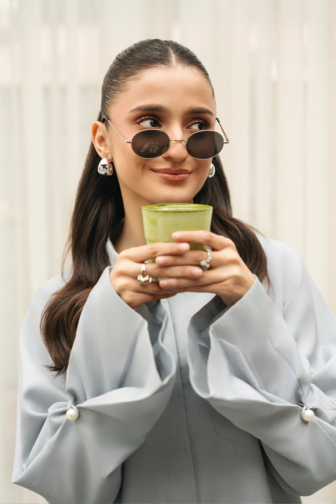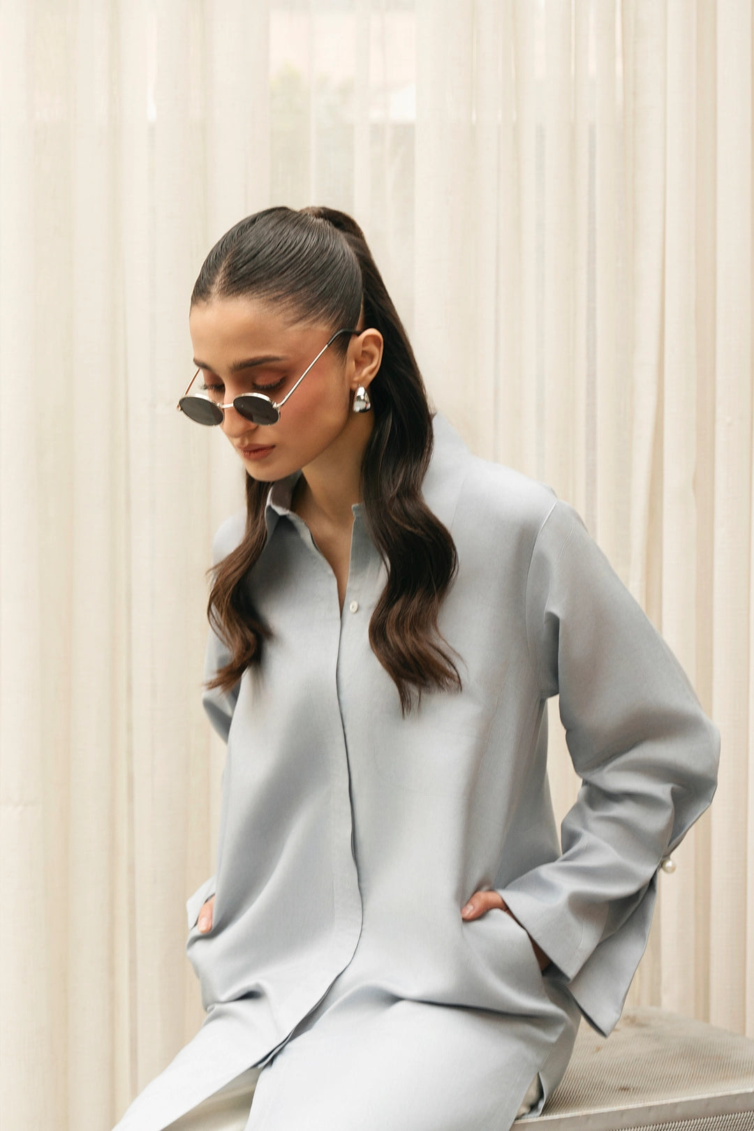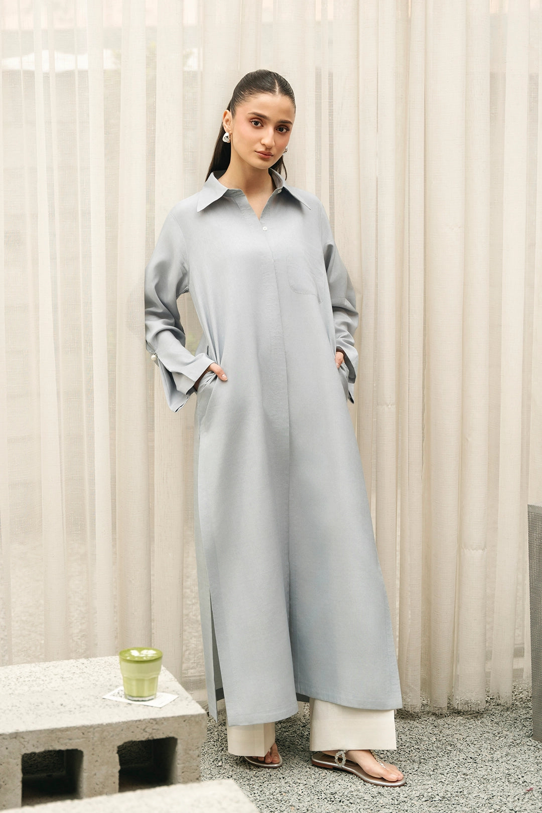 Description:• Long loose fit collared shirt• Loose trousers
