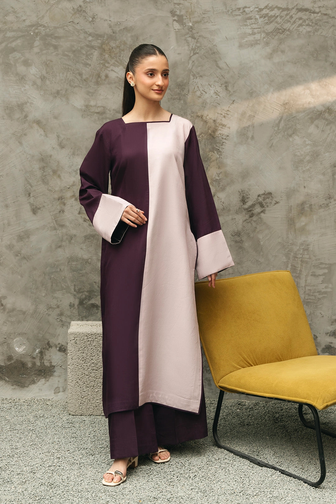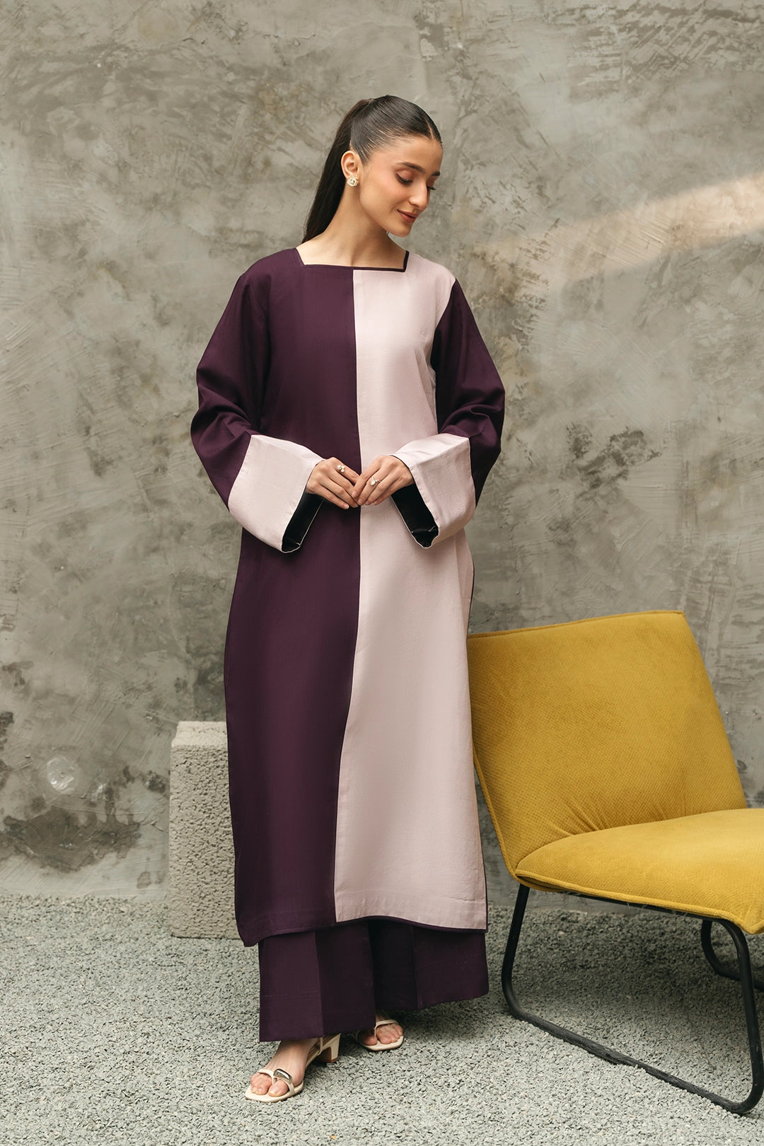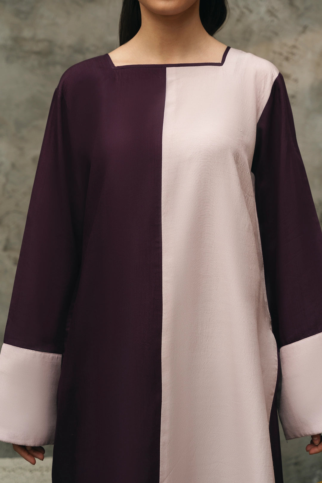 Description:• 2 tonal long shirt with slit at one side• Wide trousers